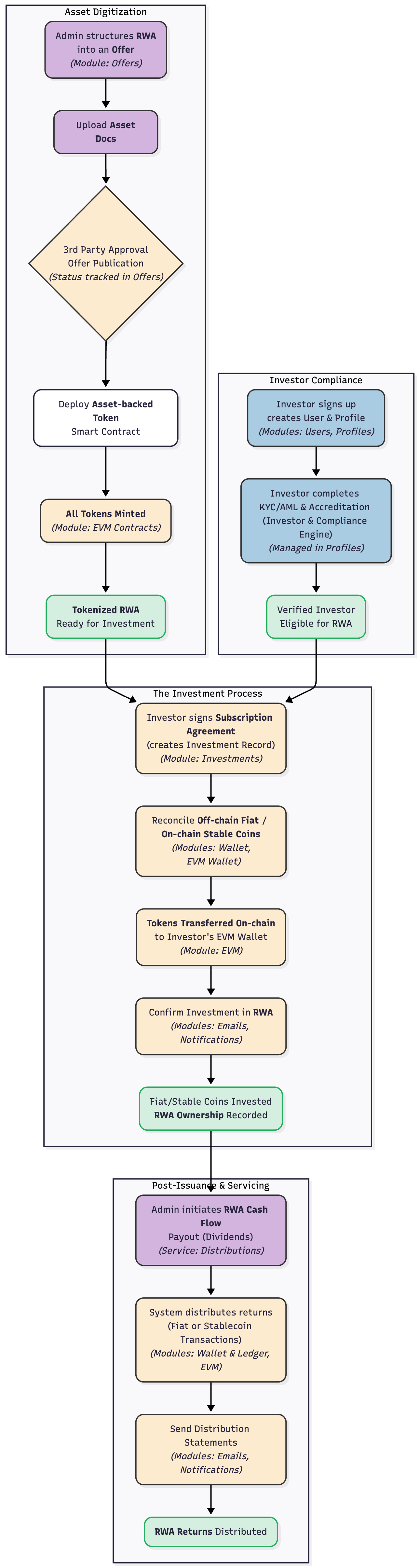The core purpose of this platform is to manage the complete lifecycle of a RWA, seamlessly connecting valuable off-chain assets with investors through tokenization. This document outlines that journey.